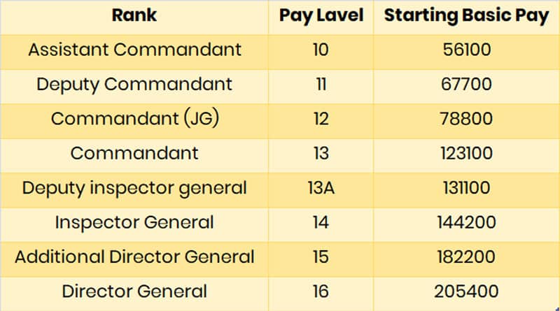इसमें जब आप शुरू में जॉइन होंगे तो आपकी सैलरी 56,100 रुपये होगी. ये एक असिस्टेंट कमांडेंट की सैलरी है. जब आप प्रमोशन पाते जाएँगे तो आपकी सैलरी बढ़ती जाएगी. इसका स्ट्रक्चर आप नीचे देख सकते हैं.
